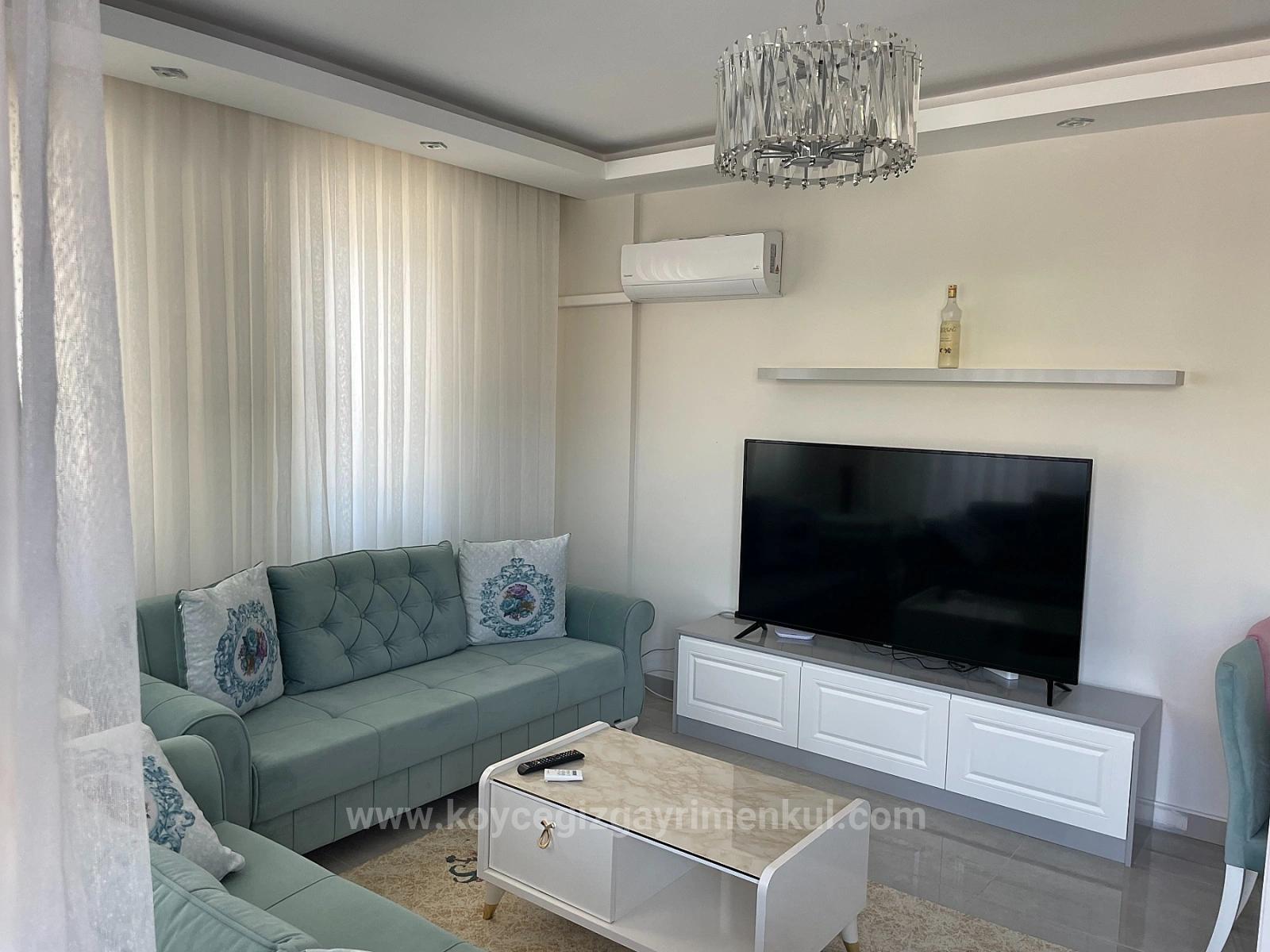 In einem Gebäude mit insgesamt 8 Wohneinheiten auf einem 1000 m² großen Grundstück im Zentrum von Dalyan steht eine Erdgeschosswohnung zum Verkauf. Die Wohnung verfügt über 2 Schlafzimmer, 1 Wohnzimmer mit offener Küche und 1 Badezimmer mit einer Wohnfläche von insgesamt 75 m². Sie ist komplett möbliert. Das Gebäude ist neu und renovierungsbedürftig. Zur Anlage gehört ein Gemeinschaftspool. Einkaufsmöglichkeiten und Supermärkte sind fußläufig erreichbar. Die Wohnung liegt 10 km vom Strand Iztuzu und 25 km vom Flughafen entfernt. Der Preis beträgt 210.000 Euro.