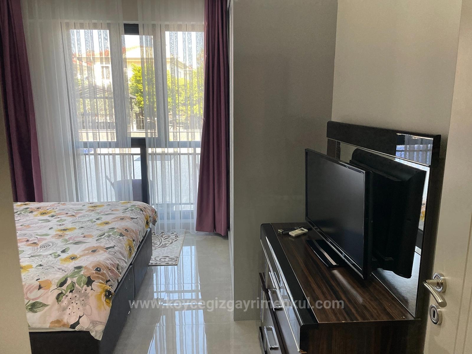 A ground floor apartment is for sale in a building with 8 apartments on a 1000m2 plot in the center of Dalyan. It has 2 bedrooms, 1 living room with open kitchen, and 1 bathroom, totaling 75 m2 of usable space. It is fully furnished. It is a new building and requires no renovations. It has a shared outdoor swimming pool. It is within walking distance of shopping markets. The apartment is 10 km from Iztuzu Beach and 25 km from the airport. The price is: 210,000 EURO