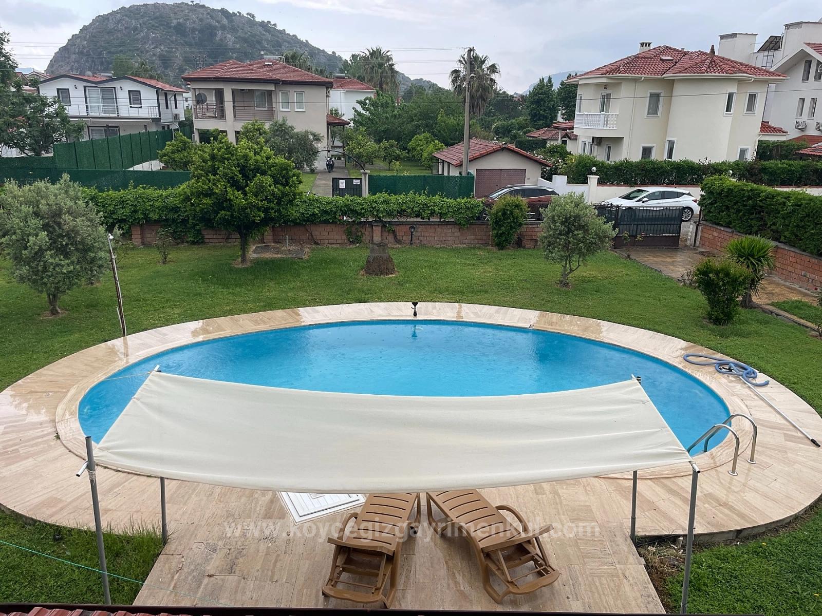 A villa with 4 bedrooms, a large open-plan living room, a separate kitchen, and 3 bathrooms, totaling 250m2 of indoor living space, is for sale in Dalyan on a 1000m2 plot. Each room has air conditioning. Heating is provided by a combi boiler. There is a fireplace and an outdoor swimming pool. The villa, which has a large garden, is within walking distance of shopping markets and the local market. It is 10 km from Iztuzu Beach and 25 km from the airport. It is within walking distance of the center. The villa requires some renovation. Price: 425,000 GBP