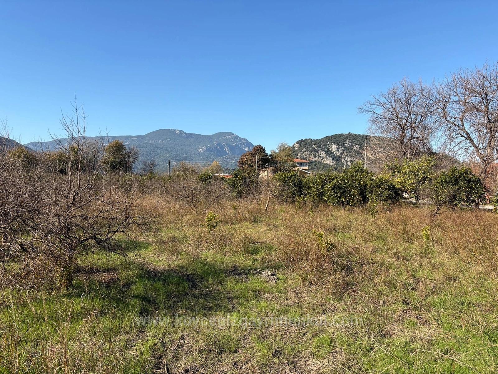 A corner plot of 4,541 m2 garden is for sale in Dalyan, close to the center. It contains various fruit trees. There are no problems with road access, water, electricity, or telephone. It is close to the boundaries of the zoning plan. It is suitable for future investment. The land is 1.5 km from the center, 11 km from Iztuzu Beach, and 25 km from the airport. The price is 25,000,000 TL