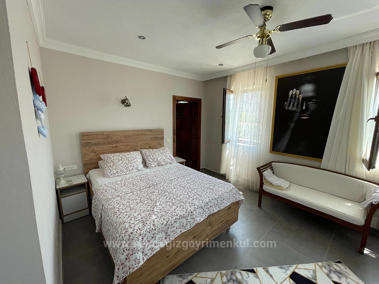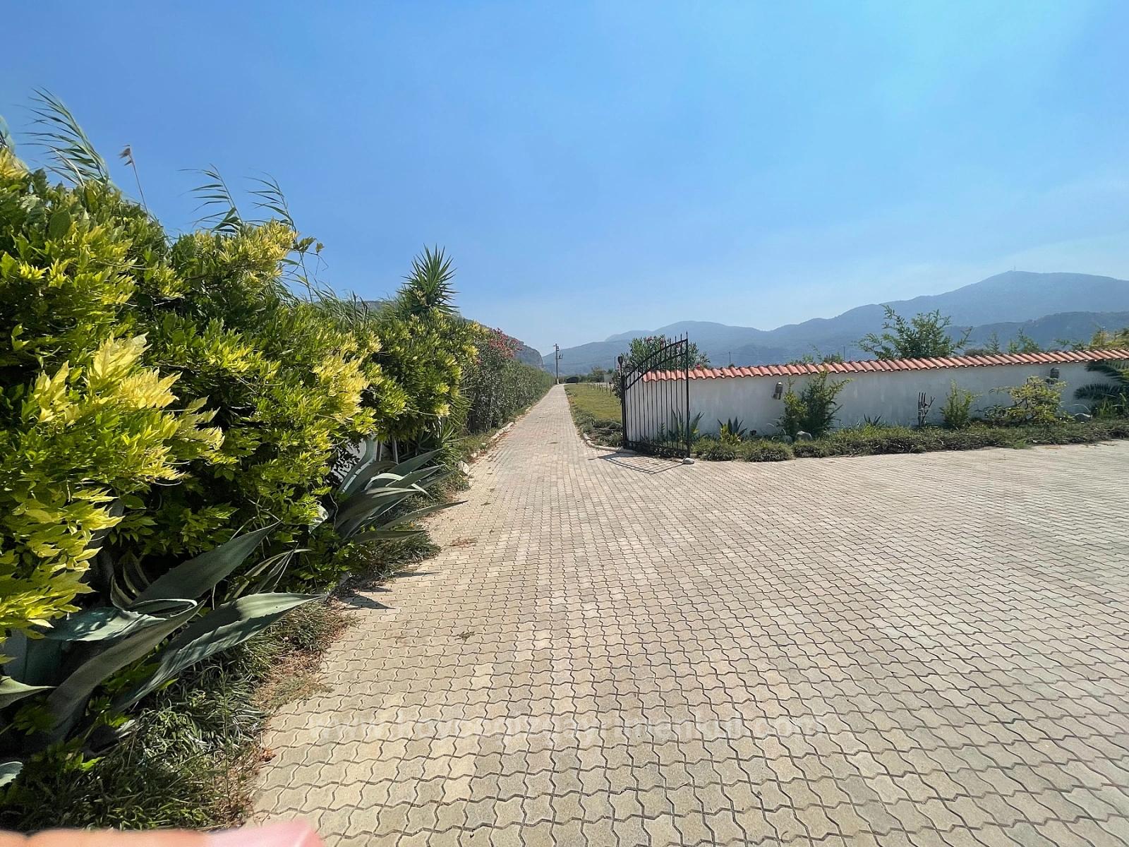 Dalyan İztuzu plaj yolu tarafında 7,000m2 arsa içerisinde 4 yatak odalı 1 salon şömüneli + mutfak bağımsız 4 banyolu full eşyalı herşey yenilenmiş her odanın kiliması vardır tüm beyez eşyaları yenidir. özel müstakil tuzlu su sistemli açık yüzme havuzlu ayrıca villanın önünde yapayı balıklı göl vardır. hahçe dizaynı yapılmı dişarıda bar bükü ve kamalya köşkü vardır. villanın geliş balkonu ve teraslıdır. hiç masrafı yoktur alış veriş ve sent pazarında 5 dk iztuzu plajına 8 km havaalanına 25 km mesafesi olan villa iztuzu ve kral mezarları manzaralıdır. fiyatı: 1,100,000GBP
